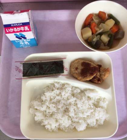 みそかつ、じゃがいもと野菜の煮もの、焼きのり、ご飯、牛乳となっております。