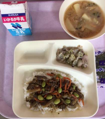 牛肉のきんぴらちらし、みそ汁、キャベツの赤じそあえ、牛乳となっています。