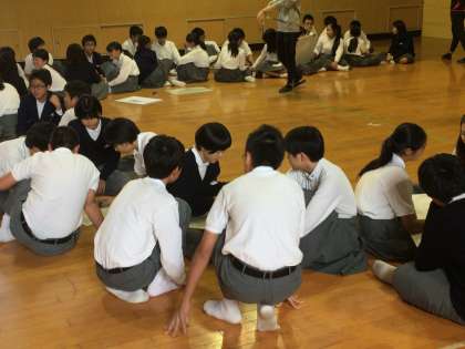 「国際理解」について学び、「給食のカレーをスプーンを使わずに食べる」等のお題に対し、グループで話し合い、有りか無しか発表していました。