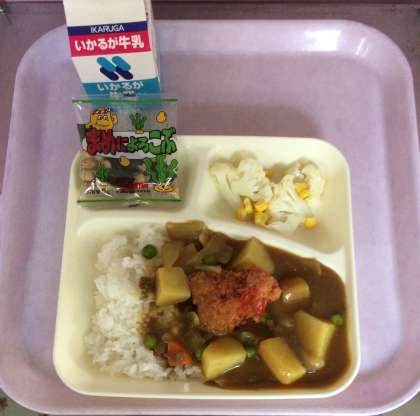 えびフライカレーライス、カリフラワーのピクルス、豆こんぶ、牛乳となっております。