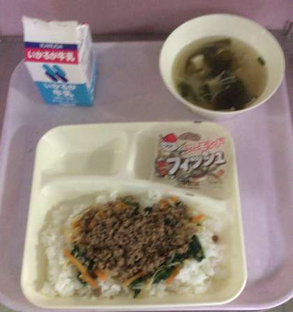 ビビンバ、わかめスープ、アーモンドフィッシュ、牛乳となっております。