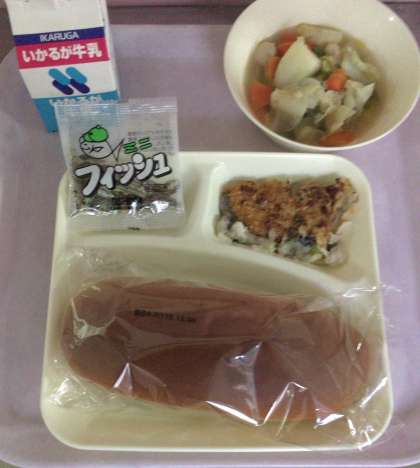 鶏肉とじゃがいものスープ煮、きのこドリア、ミニフィッシュ、パン、牛乳となっております。