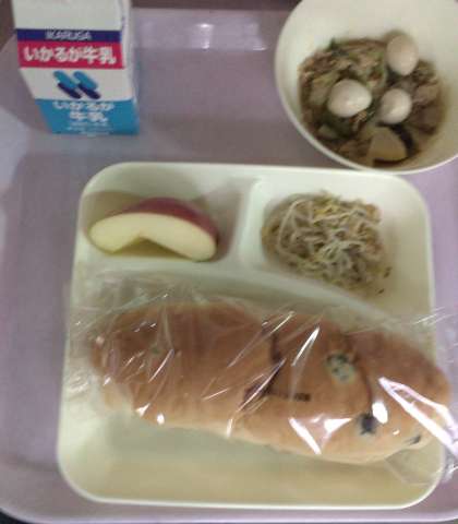 八宝菜、もやしのごま酢あえ、りんご、パン、牛乳となっております。