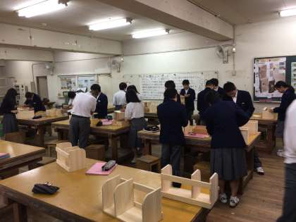 1年生は技術の授業で本立てを製作しています。 今後ニスを塗っていきます!
