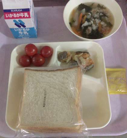 さけのマリネ、肉だんごと麦のスープ、プチトマト、アプリコットジャム、パン、牛乳となっております。