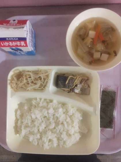 献立は、さばの味噌煮、すまし汁、もやしの柚子の香あえ、焼きのりにご飯と牛乳です。