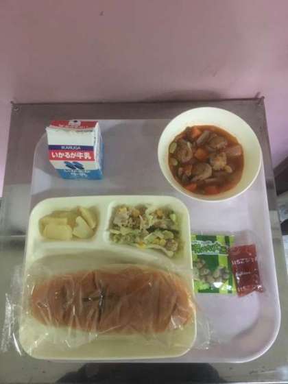 本日の献立は、ミートボールのケチャップ煮、ツナと野菜のソテー、焼きじゃが、まっちゃ大豆、パンと牛乳です。