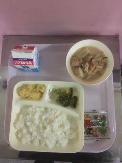 今日の献立は、かす汁、ブロッコリーのしょうがづけ、くりきんとん、豆こんぶとご飯、牛乳です。