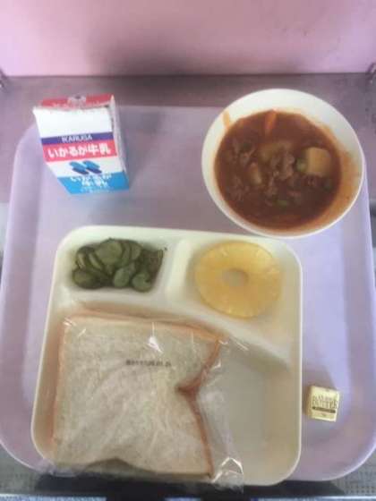 本日の献立は、ビーフシチュー、きゅうりのバジル風味サラダ、パインアップル、バターとパン、牛乳です。