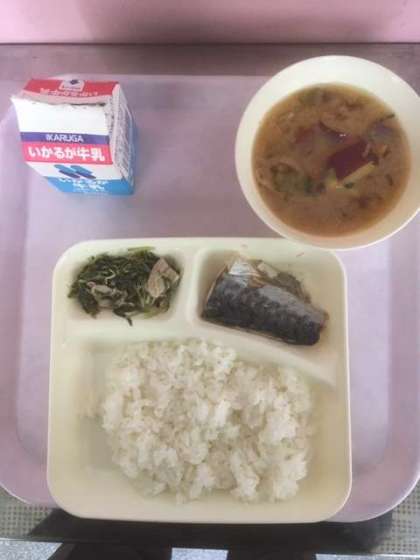 本日の献立は、さごしのしょうゆだれかけ、みそ汁、みずなの煮びたしとご飯、牛乳です。