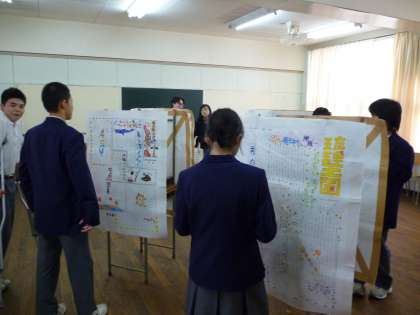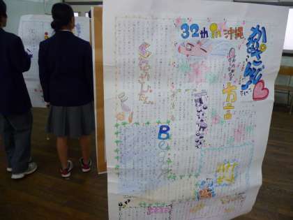 写真は、3年「修学旅行新聞」の展示の様子です。
