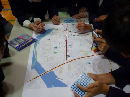 地図を使って、防災マップづくりを行いました。幹線道路や公衆電話