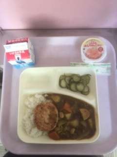 本日の献立は、牛肉と大豆のカレーライス(米粉)、とうふハンバーグ、きゅうりのピクルス、りんごゼリーと牛乳です。