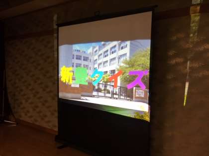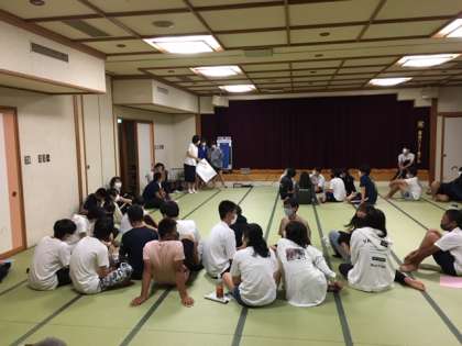 夜レクをしています。班ごとに力を合わせて難題に挑戦しています。たいへん盛り上がっています。