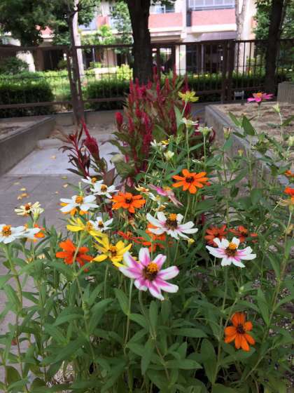 本日、大阪市の「種から育てる地域の花づくり事業」の方々からジニアとケイトウをいただきました。体育館前に植えています。提供していただき、ありがとうございました。(写真手前がジニア、奥がケイトウです。)
