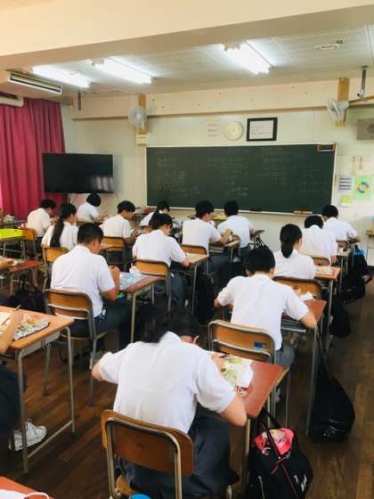 仲良く食べています。献立は、イタリアンスパゲッティ、グリーンアスパラとキャベツのサラダ、豆こんぶ、パンと牛乳です。