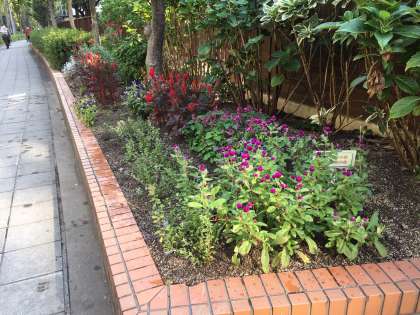 正門前の花壇には、今日もきれいな花々が咲いています。
