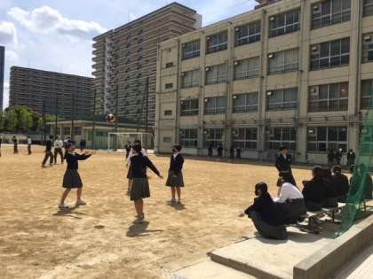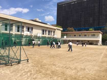 昼休みは運動場でたくさんの生徒がボール遊びをしています。
