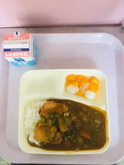 献立はカツカレーライス、フルーツ白玉と牛乳です。