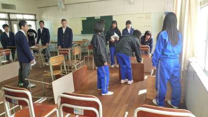 そののち教室での避難室づくり体験(間仕切り、物資搬入・