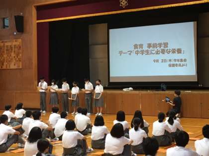 2年生学年朝礼では、保健委員が2学期以降に予定している「食育」の事前学習を行いました。中学生として心がけるべき栄養素の摂取など、とても大切な学習です。