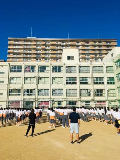 グラウンドで行われ、学校長より自分で自分自身を見つめる大切さ、生徒指導主事より行事後の学校生活についての講話がありました。