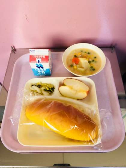 本日の献立は、コーンクリームシチュー(米粉)、はくさいのピクルス、りんご、パンと牛乳です。
