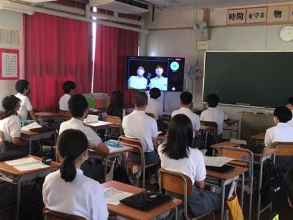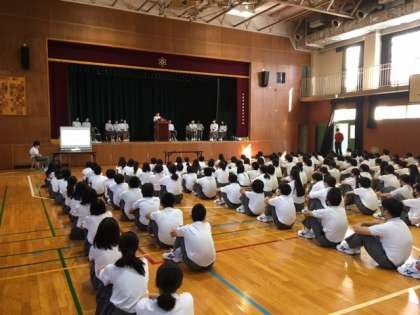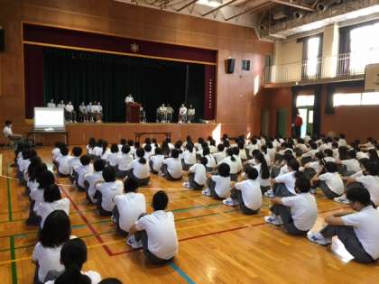 1・2年生は体育館、3年生はオンラインで参加しています。