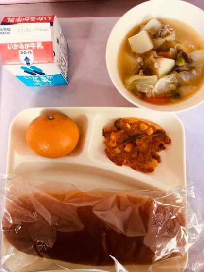 本日の献立は、豚肉と野菜のスープ煮、変わりピザ、みかん、パンと牛乳です。