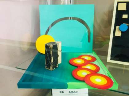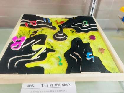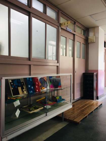 校長室前には、色とりどりの3年生美術科作品が展示されています。