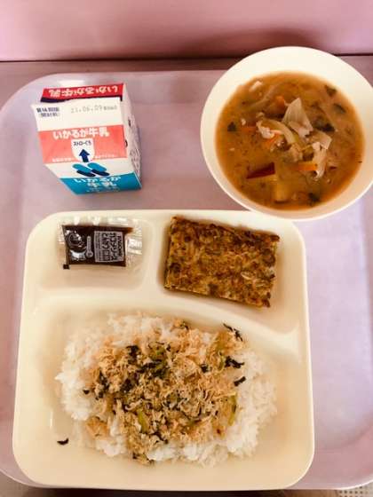 本日の献立は、お好み焼き、豚汁、とりなっ葉いため、ご飯と牛乳です。
