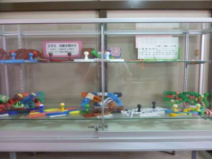 現在、校長室前の陳列ケースに、2年生の美術の授業で作った木彫小物かけと1年生家庭科の授業で作ったしおり作り(平織り・綾織り・朱子織り)の作品が展示されています。