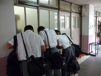 休み時間や放課後に、校長室前を通る生徒が良く作品を見ています。学校にこられたときには、ぜひ見て帰ってください。