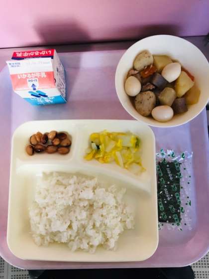 本日の献立は、関東煮、はくさいの甘酢あえ、とら豆の煮もの、ご飯と牛乳です。