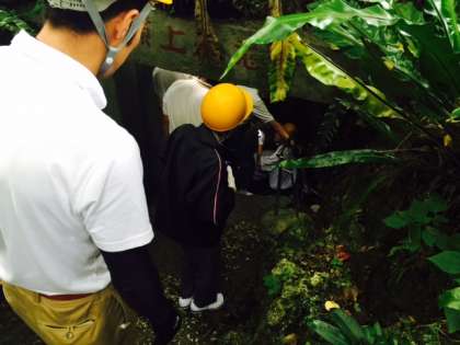 曇り空も晴れ間が見え蒸し暑くなってきました。糸数アブチラガマを体験します。ヘルメット、軍手を装着し、懐中電灯を手にして、ガマの中に入って行きました。