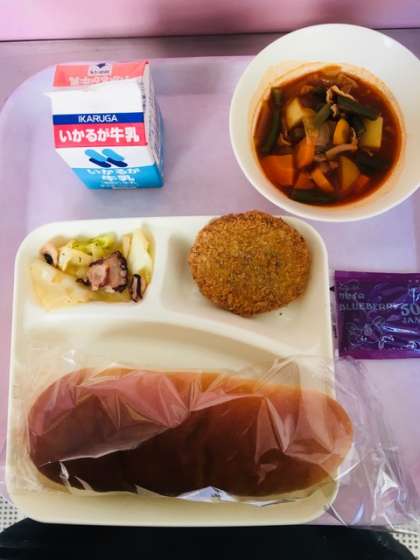 本日の献立は、チキンレバーカツ、ケチャップ煮、タコとキャベツのバジルソテー、パンと牛乳です。