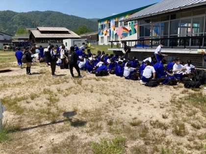 びわ湖青少年の家に到着しました。健康チェックをしています。