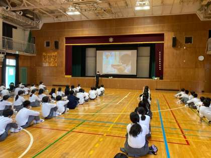 2年生は体育館で映像を見ながら一泊移住の振り返りをしています。