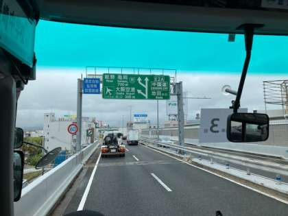 大阪空港付近を走行しています。子どもたちはバスレクCDを聴いています。