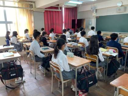 <写真は放送を聴く1年生の様子です>