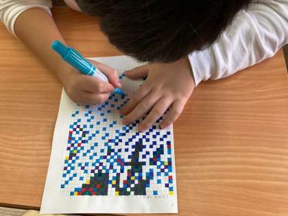 マス目に色を塗って、モザイクアートに取り組んでいます。