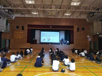 2年生では、班ごとに調べた国についてプレゼンテーションする取り組みを行っています。今日は3組の生徒全員が調べたことを発表しました。