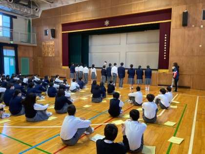 今日の学年朝礼では、先週の校外学習での班行動で優勝な成績を収めた班が表彰されました。