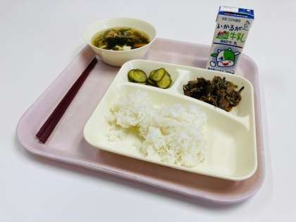 プルコギ、豆腐とわかめのスープ、きゅうりの甘酢漬け