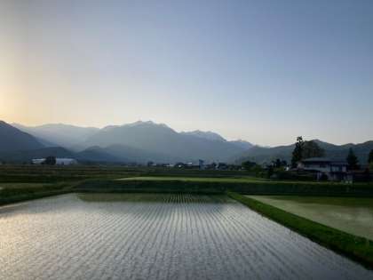 大町市を走行しています。 北アルプスの麓までもう少しかかりそうです。