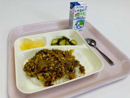 大豆入りキーマカレーライス、きゅうりのサラダ、洋なし