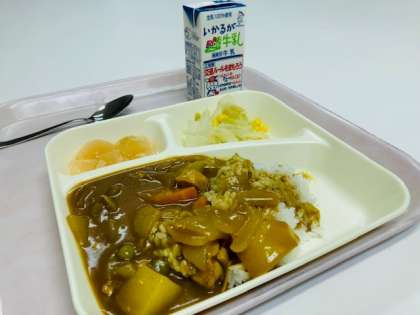 チキンカレーライス、キャベツとコーンのサラダ、白桃