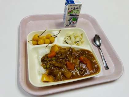 ハヤシライス(米粉)、キャベツのひじきドレッシング、さくらんぼ(缶)