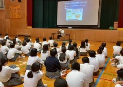 5・6時間目に2年生で食育を行っています。栄養教諭を招いて、中学生に必要な栄養をとるためにどうすればよいかを学んでいます。
