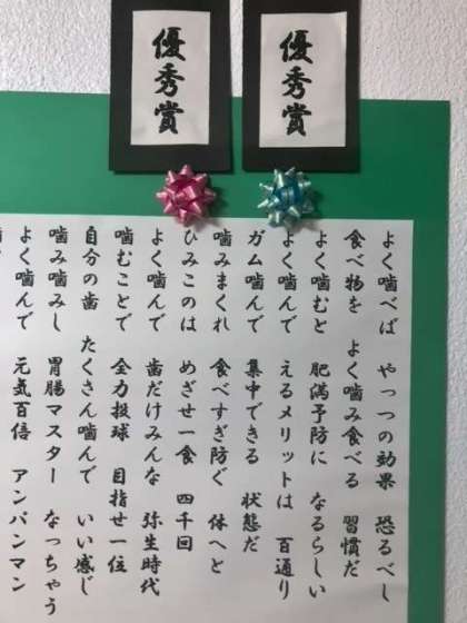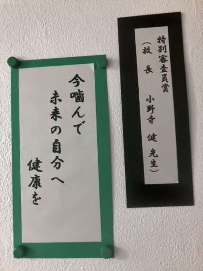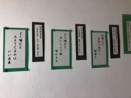 「噛むことは大切」「これを見たら楽しく噛んで食事ができる」をテーマに1年生が考えた俳句を1階廊下に掲示しています。